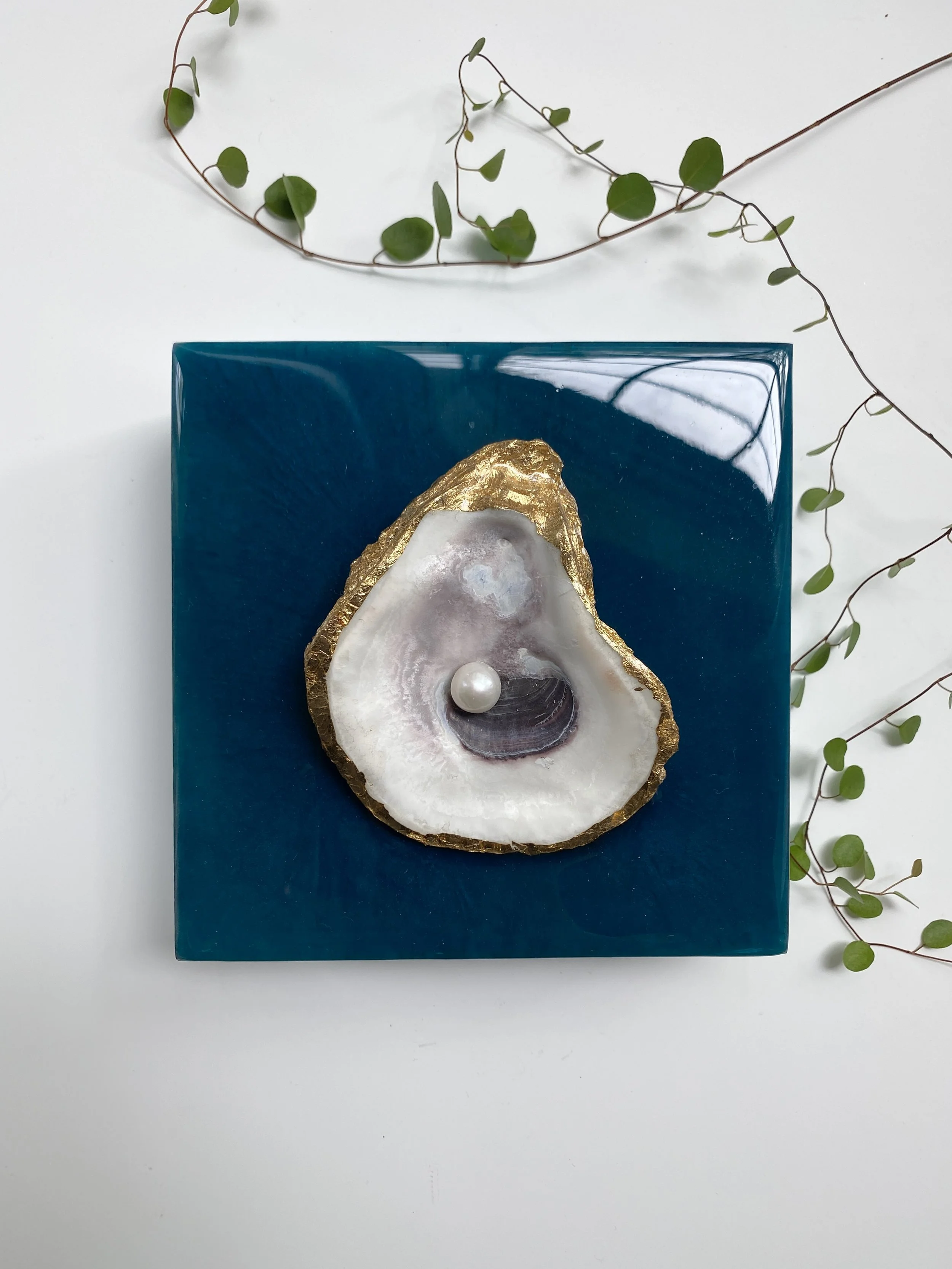 Materials: Resin, genuine oyster and freshwater pearl on wood panel.